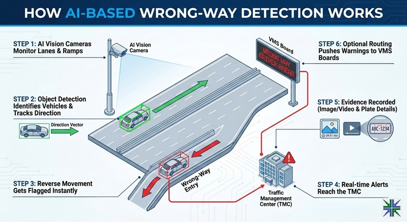 AI vision cameras monitor lanes and ramps continuously and track vehicles through object detection and a direction vector. When movement shifts against the intended flow, the camera flags the event and sends an alert to the TMC. The process supports early operator action.