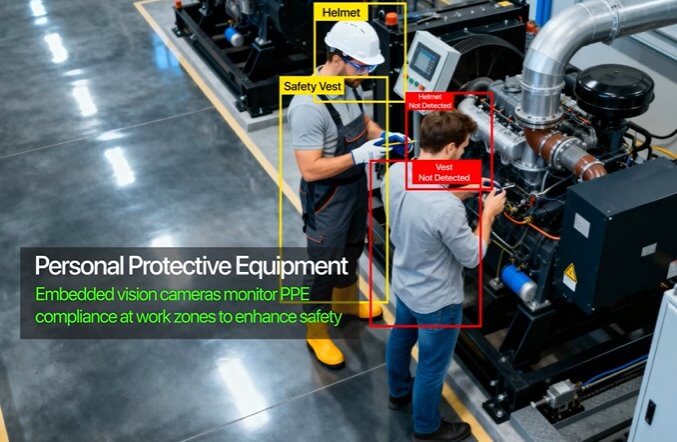 Durable enclosures withstand dust, heat, vibration, and airborne debris in demanding floors. So, with a rugged smart camera, PPE checks continue even during heavy equipment cycles. It also enables placement near machinery where vision hardware usually struggles.