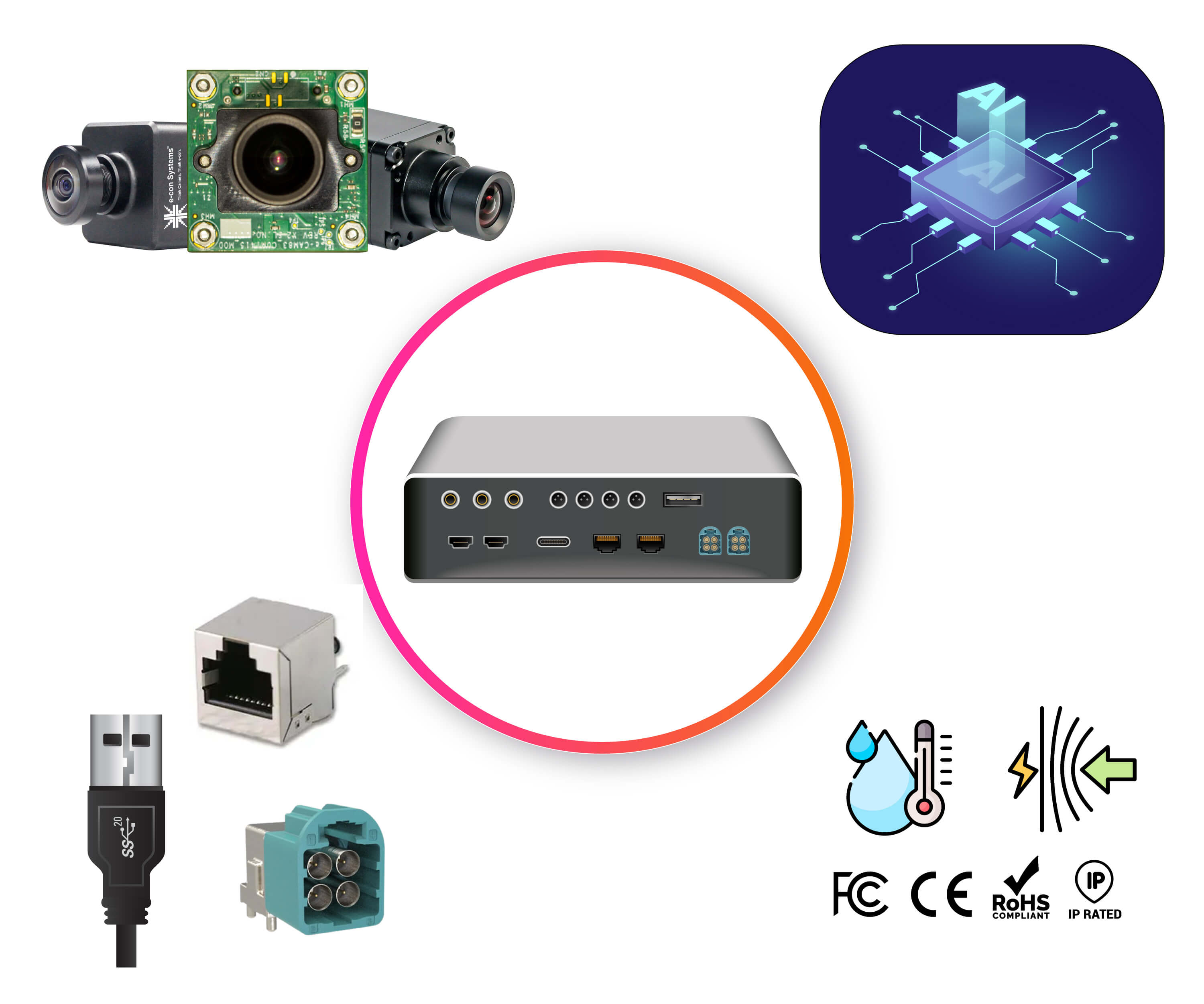 - 長年にわたる生産および技術的な経験を有するe-con Systemsは、エンドツーエンドの製品開発する能力を持ち、どの業界のニーズにも対応した信頼性の高い、かつ高度にカスタマイズされたエッジAIビジョンボックスソリューションを提供します。