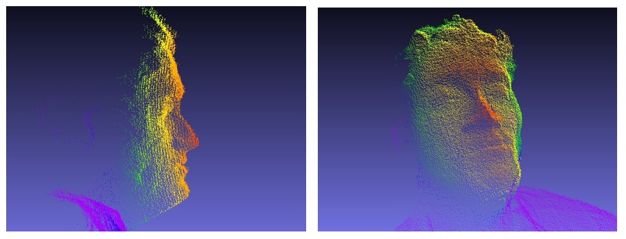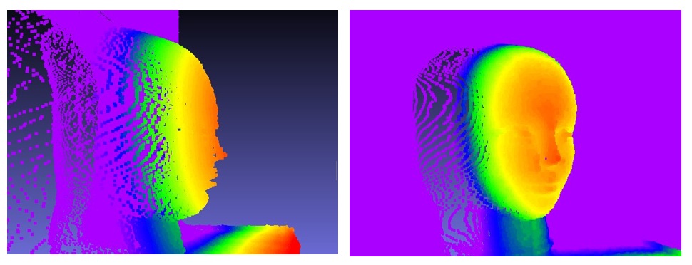 The following examples show depth data captured using DepthVista Helix, demonstrating how facial surface characteristics differ between a live subject and a presentation attack artifact.
