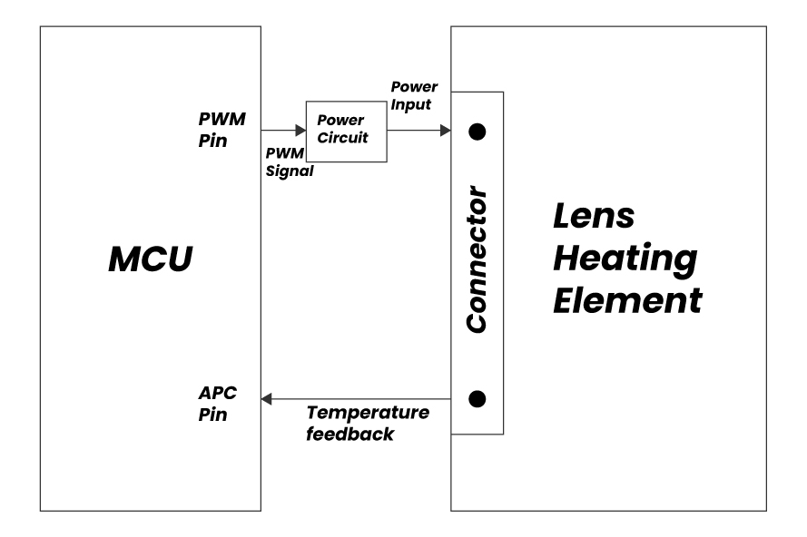 The microcontroller unit (MCU) continuously monitors the lens temperature. Using a pulse-width modulation (PWM) signal, it automatically adjusts the power delivered to the heating element to maintain the lens temperature.